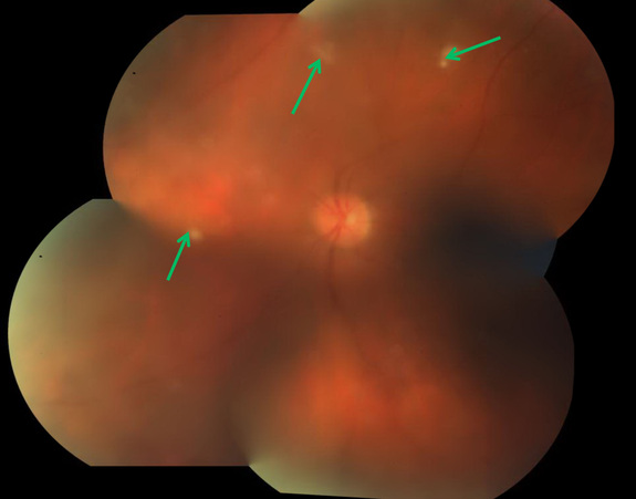 Fundus photograph of a 53-year-old woman who presented with blurred vision and floaters for several months. She had a history of an undiagnosed autoimmune disease and had been treated with prednisone for the past 14 years, with failed trials of numerous immune modulating medications. Examination showed vitreous cells and debris with puff balls in the left eye. There were preretinal white infiltrates in the periphery (green arrows). She had a history of numerous courses with IV antibiotics; the long indwelling intravenous lines may have been the probable source of the fungal infection. She underwent vitrectomy for sampling and culture of the vitreous as well as debulking of the infectious load together with intravitreal amphotericin B 5 micrograms and oral voriconazole 200 mg twice daily.